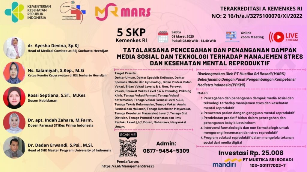 Tatalaksana Pencegahan dan Penanganan Dampak Media Sosial dan Teknologi Terhadap Manajemen Stres dan Kesehatan Mental Reproduktif Diselengarakan Oleh PT Mustika Sri Rosadi (MARS) Bekerjasama Dengan Pusat Pengembangan Kompetensi Medistra Indonesia (PPKMI) Berakhir Pada Link LMS Link LMS Daftar Hadir Daftar Hadir Virtual Background Virtual Background Link Zoom Link Zoom Link Youtube Link Youtube Susunan Acara Susunan Acara PRE TEST PRE TEST Materi Materi